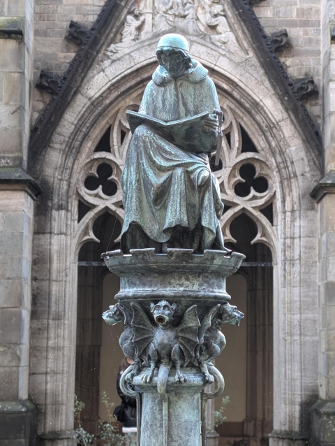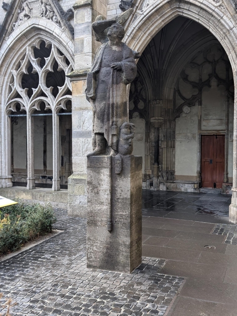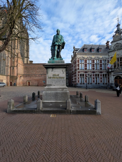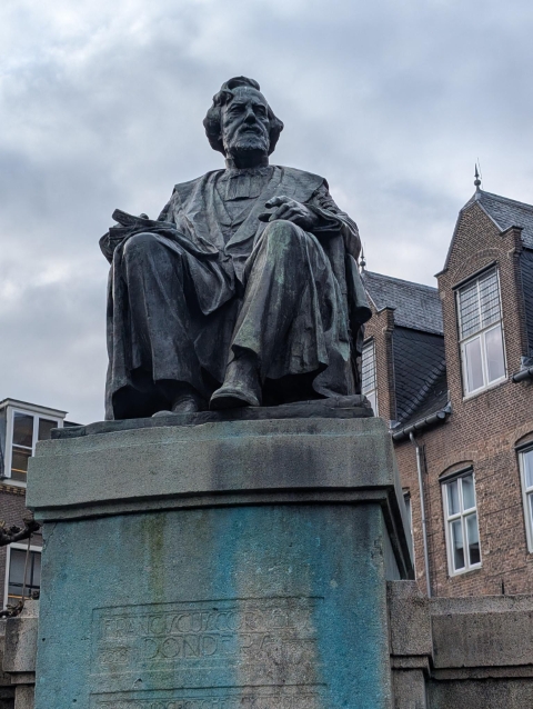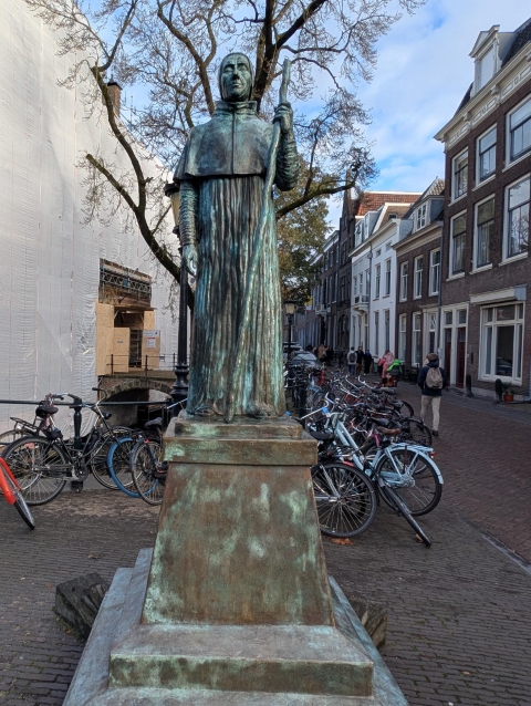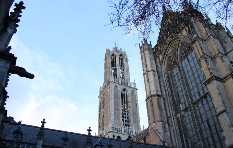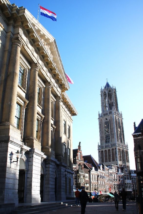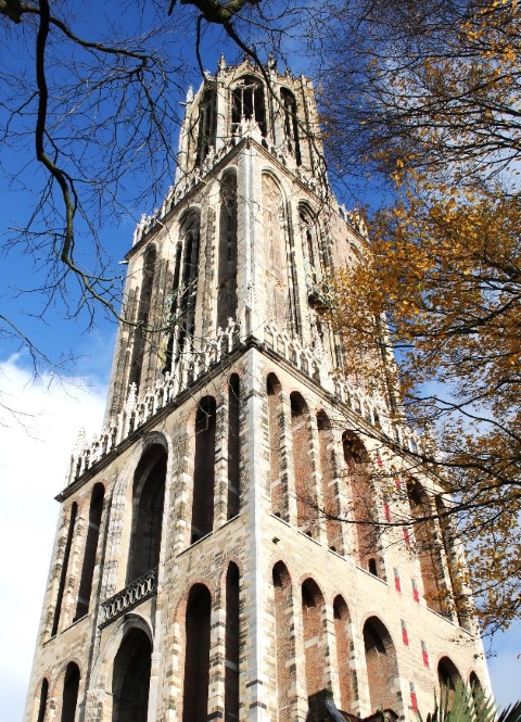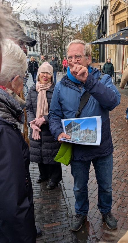 Ondanks dat het restaurant speciaal voor ons pas vanaf 11.00 uur open ging stonden beide dagen leden voor een dichte deur. Maar toen ze eenmaal naar binnen mochten, keken ze hun ogen uit naar de enorm vele mooi ingerichte ruimtes onder het stadhuis van Utrecht. Waar vroeger de veroordeelden gewurgd werden, dronken onze leden een kopje koffie met warme apfelstrudel en vanille saus erbij. De eerste dag was het eerste kopje koffie heerlijk, want toen was het best fris buiten. De tweede dag smaakte het kopje koffie nog beter, want toen kwam bijna iedereen nat en koud binnen. Rond kwart voor twaalf werden wij door diverse gidsen rondgeleid door de historische binnenstad van Utrecht. De geschiedenis van Utrecht gaat ruim 1300 jaar terug. Zendeling Willibrord bouwde in het voormalige Romeinse Castellum op het huidige Domplein twee kerkjes. Hij wijdde één kerkje aan Sint Maarten, de allereerste versie van de huidige Domkerk en het andere kerkje werd opgedragen aan Sint Salvator. Aan beide kerkjes verbond Willibrord een klooster. In 1015 startte bisschop Adelbold de bouw van de Romaanse Dom. Nu is de Domtoren het symbool van Utrecht en uiteraard de trost van de stad vooral na de restauratie. Het is 112 meter hoog en dus de hoogste kerktoren van Nederland. Het is teveel om de hele rondleiding in dit verslag te verwerken. Was u niet bij één van deze twee evenementen aanwezig, dan is een bezoek aan DOMunder een aanrader. Hier hoor je en zie je het hele verhaal van het ontstaan van de stad Utrecht.