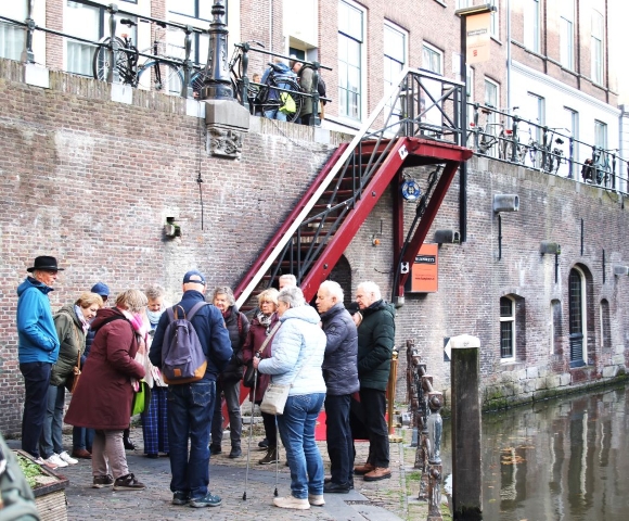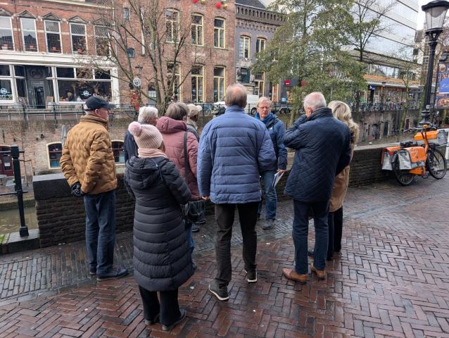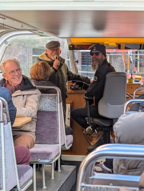 Om 14.15 uur lag de rondvaartboot voor de deur klaar en werden de gasten door een echte Utrechtse kapitein aan boord geholpen. De gidsen vertelden veel over de historie van Utrecht. Onder andere dat de witte trappen aan de kades van de werven allemaal uitkomen op een steeg. Want vroeger stonden aan de gracht mooie stenen panden, maar daarachter waren alle woningen van hout. Als er een brand uitbrak in de houten huizen luidde een kerkklok en moest elke bewoner van het grachtenpand 3 emmers meet water vullen d.m.v. een lint werd geprobeerd de brand te blussen.